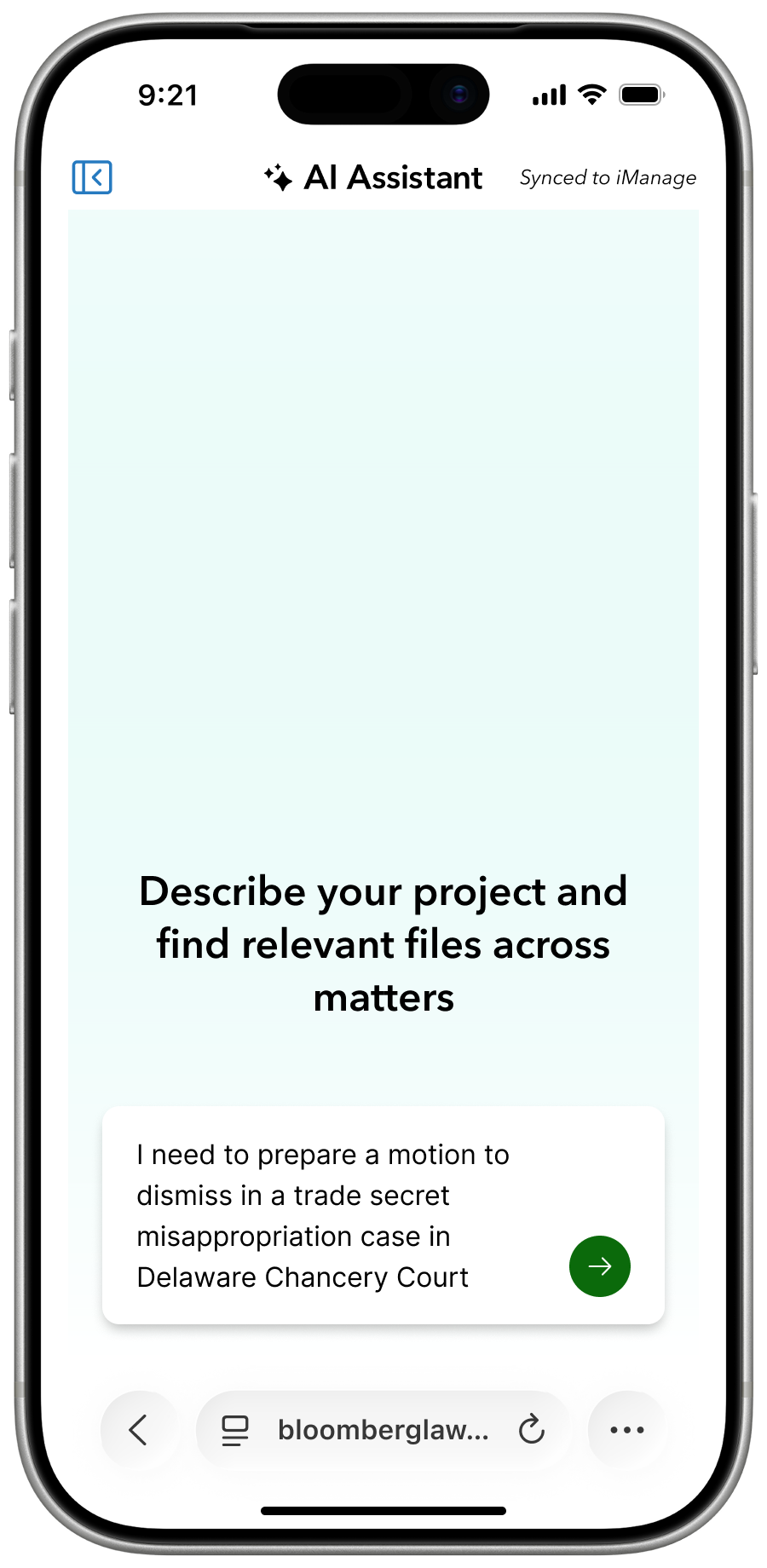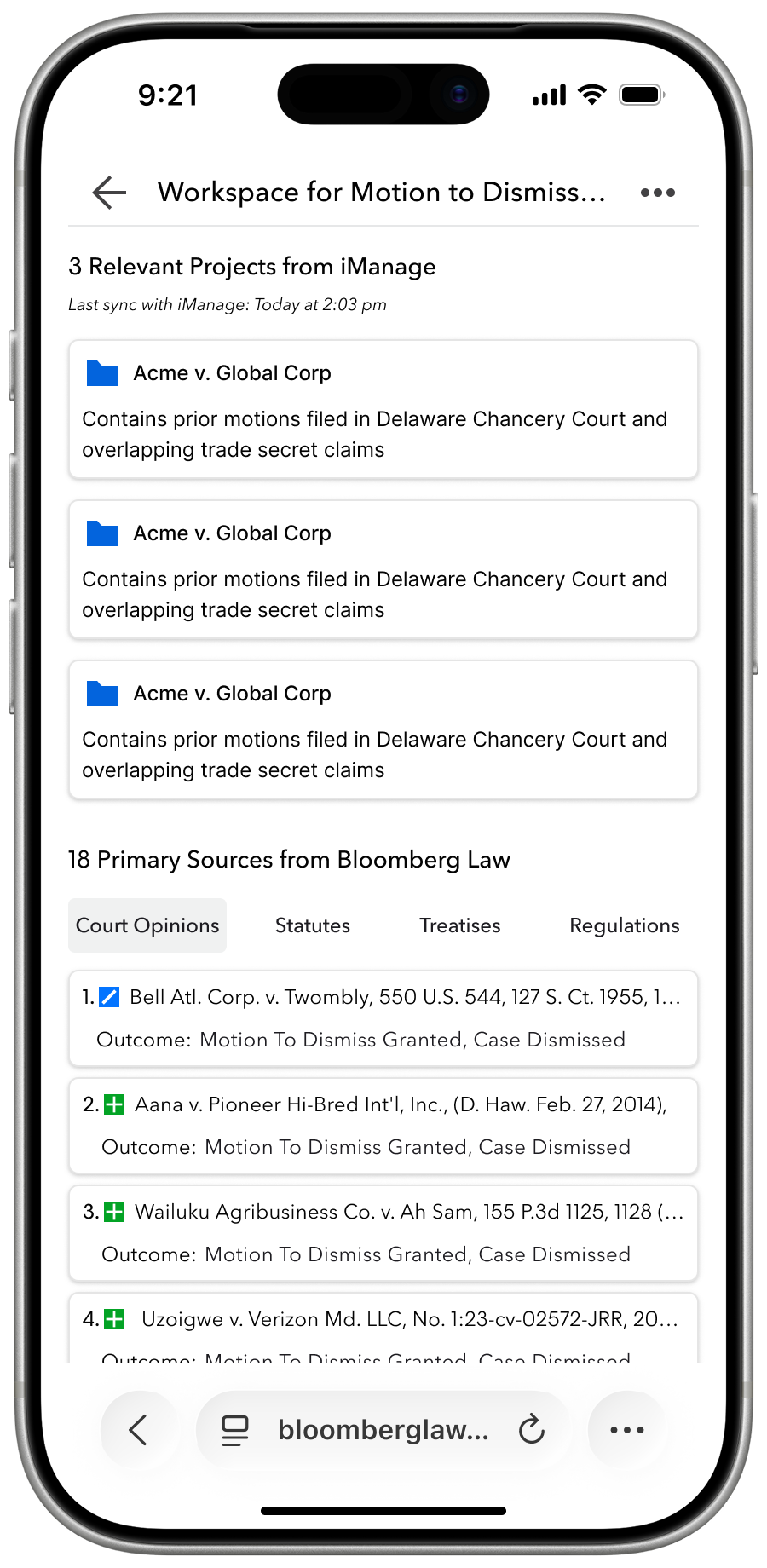 A single intent surfaces iManage matter history and ranked Bloomberg Law primary sources simultaneously. DMS integration is the biggest adoption hurdle for any legal AI tool. Solving it at the point of intent — rather than as a separate workflow — was a deliberate decision grounded in research.