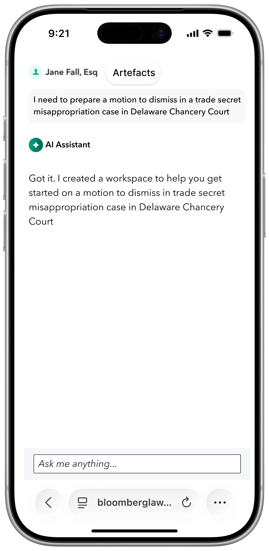 The AI Assistant predicts the best way to help the user jumpstart the project is to scan integrated databases and Bloomberg Law's library and creates a workspace